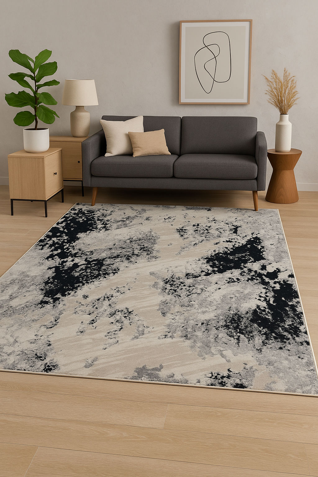 Covor modern în tonuri neutre de alb, negru și gri, cu un design abstract elegant ce adaugă profunzime și rafinament oricărui spațiu. Potrivit pentru interioare contemporane, minimaliste sau industriale, este ușor de integrat și de întreținut, oferind un plus de confort și stil.