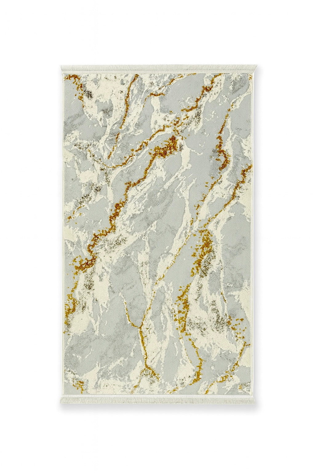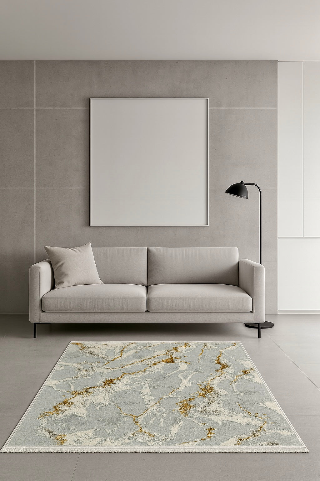 Covor modern cu design abstract marmorat în nuanțe de gri deschis, alb și accente aurii. Ideal pentru interioare minimaliste, oferă un aspect elegant și luminos. Material moale, durabil și ușor de întreținut. Potrivit pentru living, dormitor sau birou.