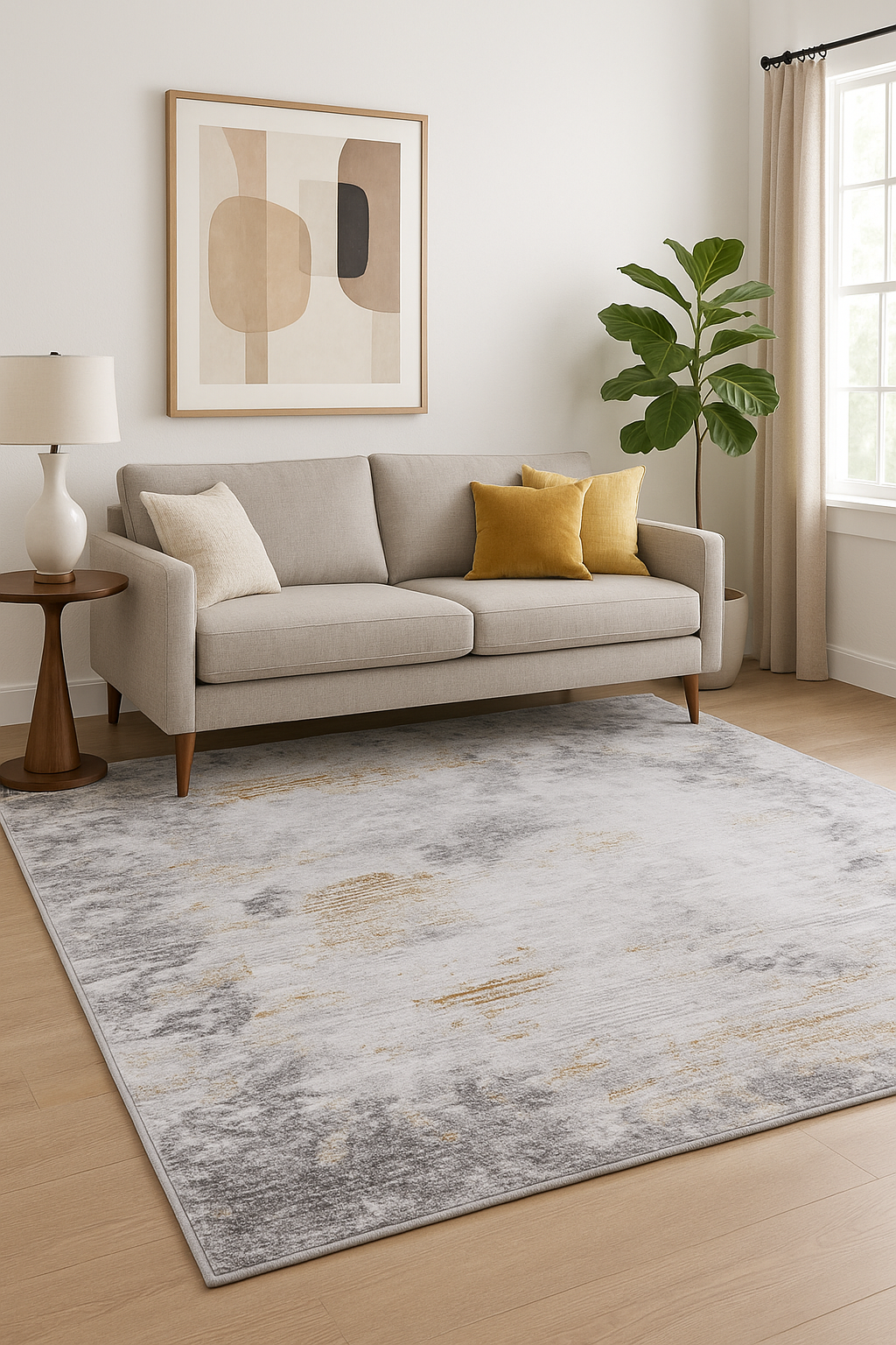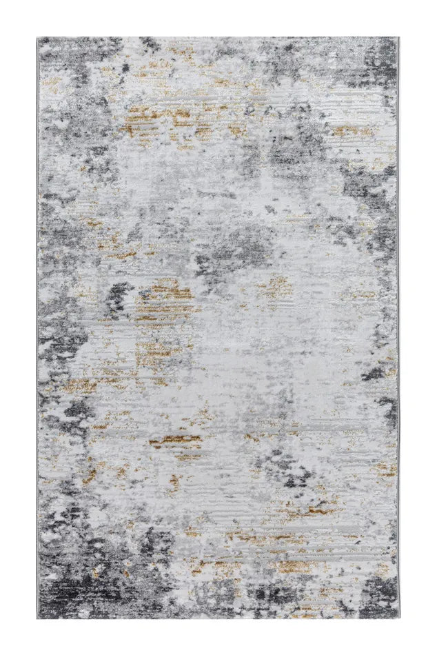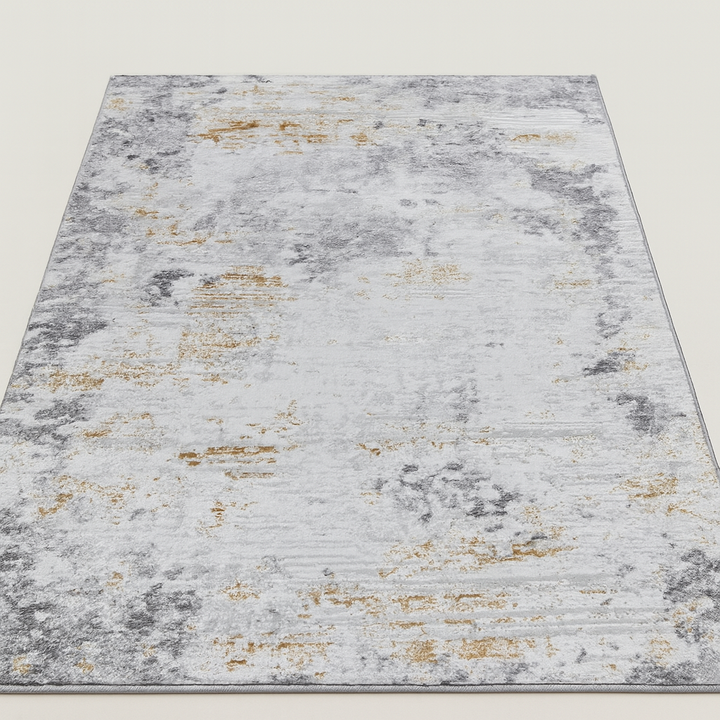 Covor modern cu design abstract în tonuri elegante de gri, alb și accente aurii. Ideal pentru interioare contemporane, aduce un plus de rafinament și lumină oricărui spațiu. Fabricat din materiale durabile, ușor de întreținut