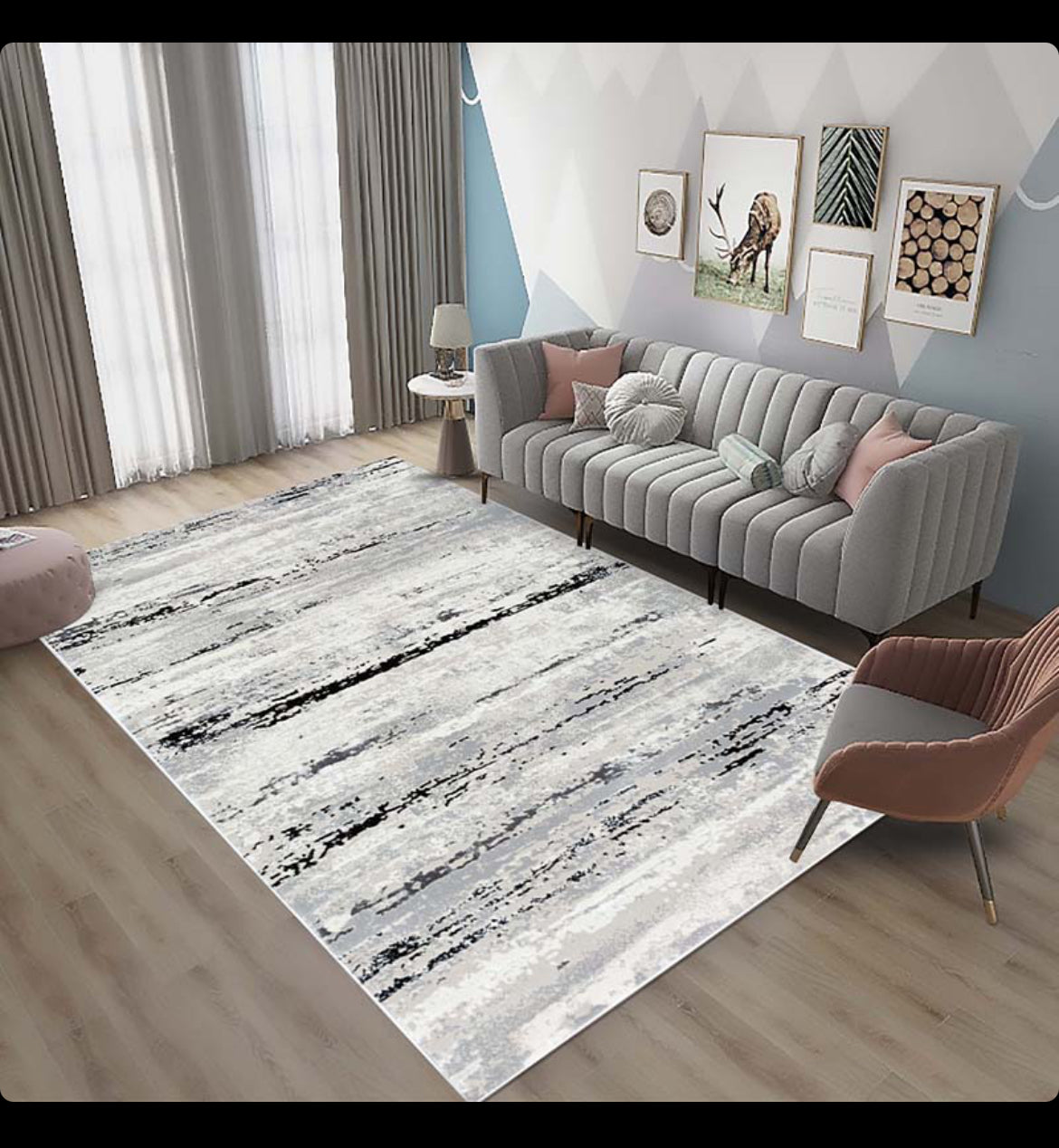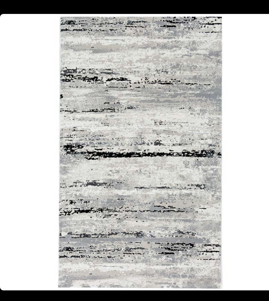 Un covor stilizat cu dungi neregulate în tonuri de gri, alb și negru, ideal pentru interioare contemporane. Designul abstract adaugă textură vizuală și un aer sofisticat oricărei camere.