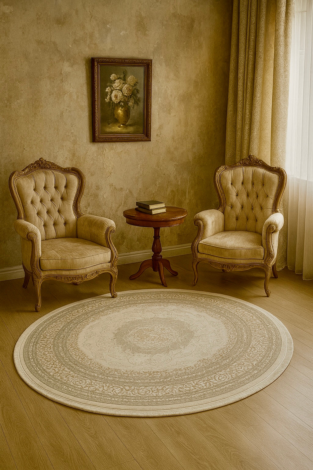 Covor rotund cu design clasic oriental, în nuanțe elegante de crem, bej și auriu, ideal pentru interioare rafinate. Modelul bogat în detalii adaugă un aer sofisticat oricărui spațiu. Disponibil în mai multe dimensiuni și și în variantă dreptunghiulară, pentru a se potrivi perfect oricărui tip de amenajare.