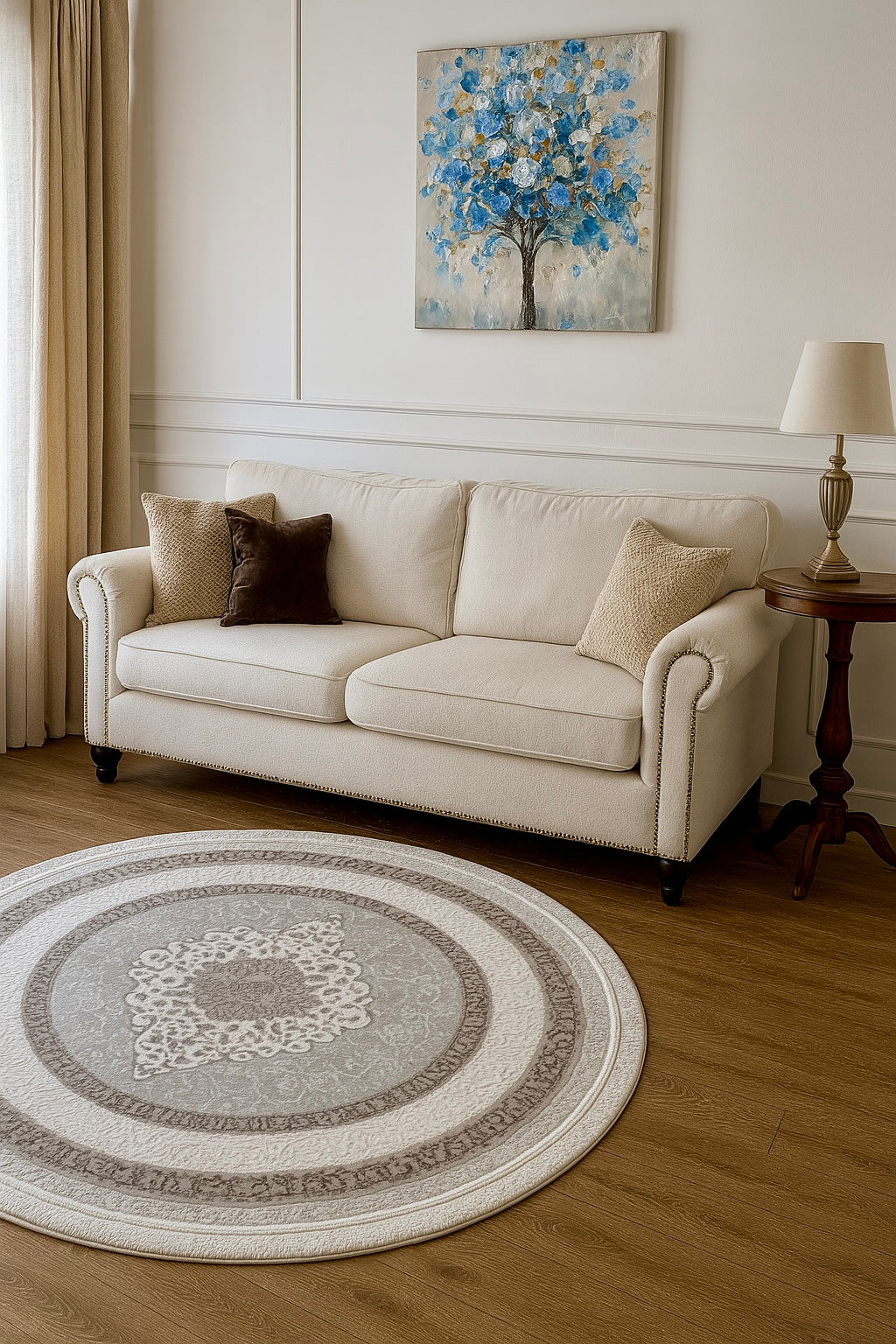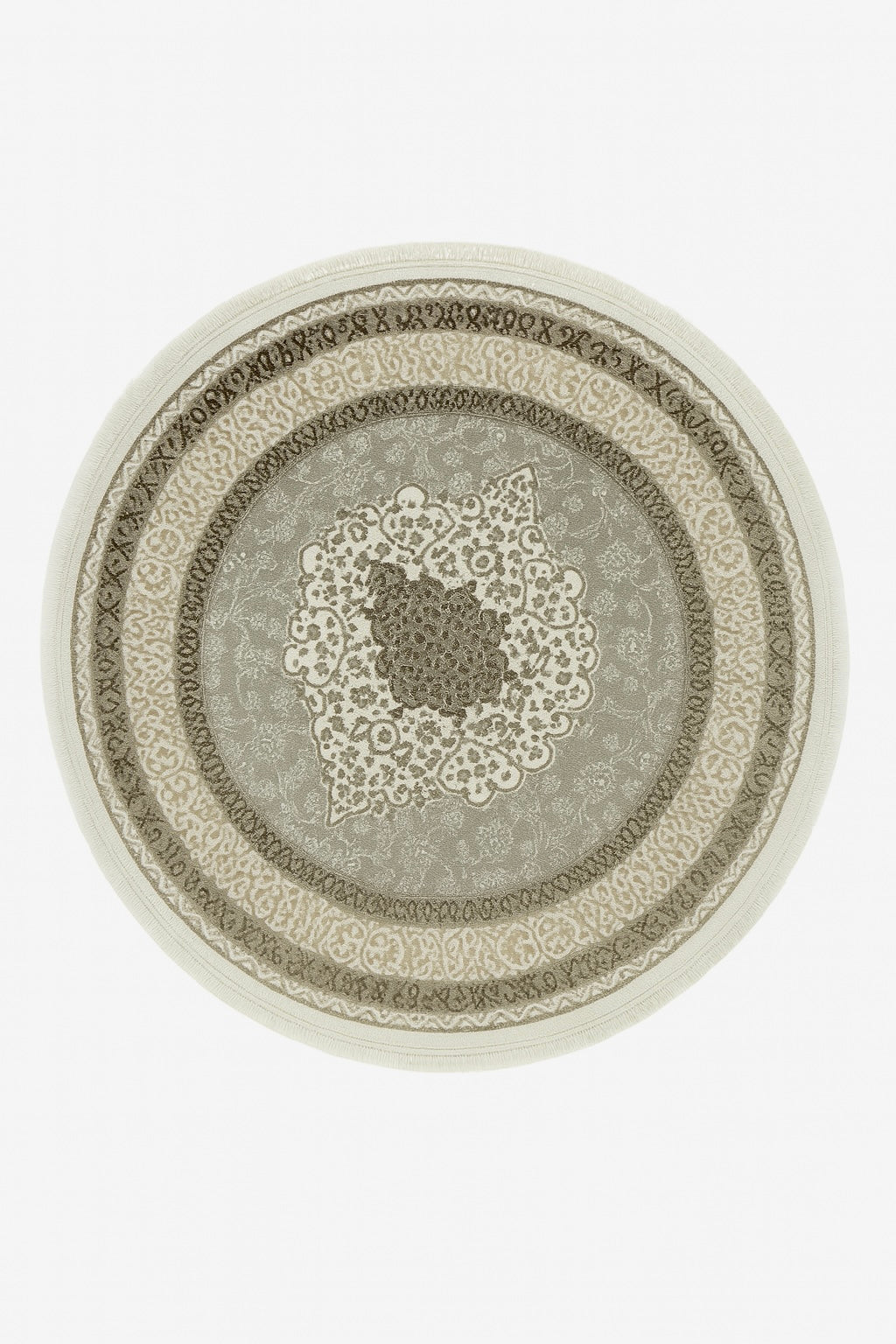 Covor rotund cu design clasic oriental, în nuanțe elegante de crem, bej ideal pentru interioare rafinate. Modelul bogat în detalii adaugă un aer sofisticat oricărui spațiu. Disponibil în mai multe dimensiuni și și în variantă dreptunghiulară, pentru a se potrivi perfect oricărui tip de amenajare.
